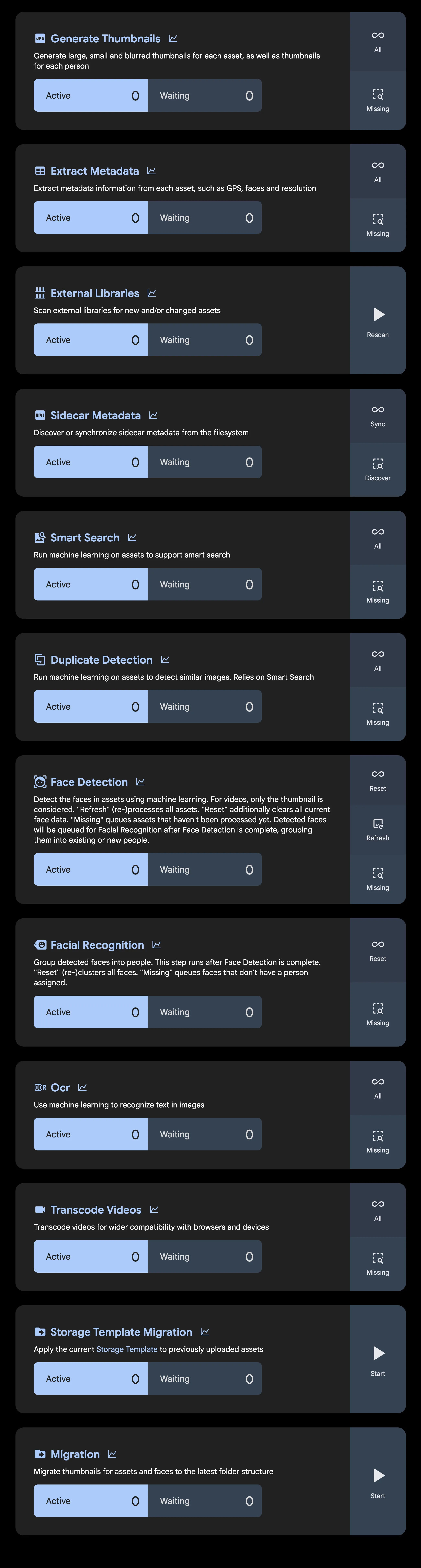 When a new asset is uploaded it kicks off a series of jobs, which include metadata extraction, thumbnail generation, machine learning tasks, and storage template migration, if enabled. To view the status of a job navigate to the Administration -> Jobs page.