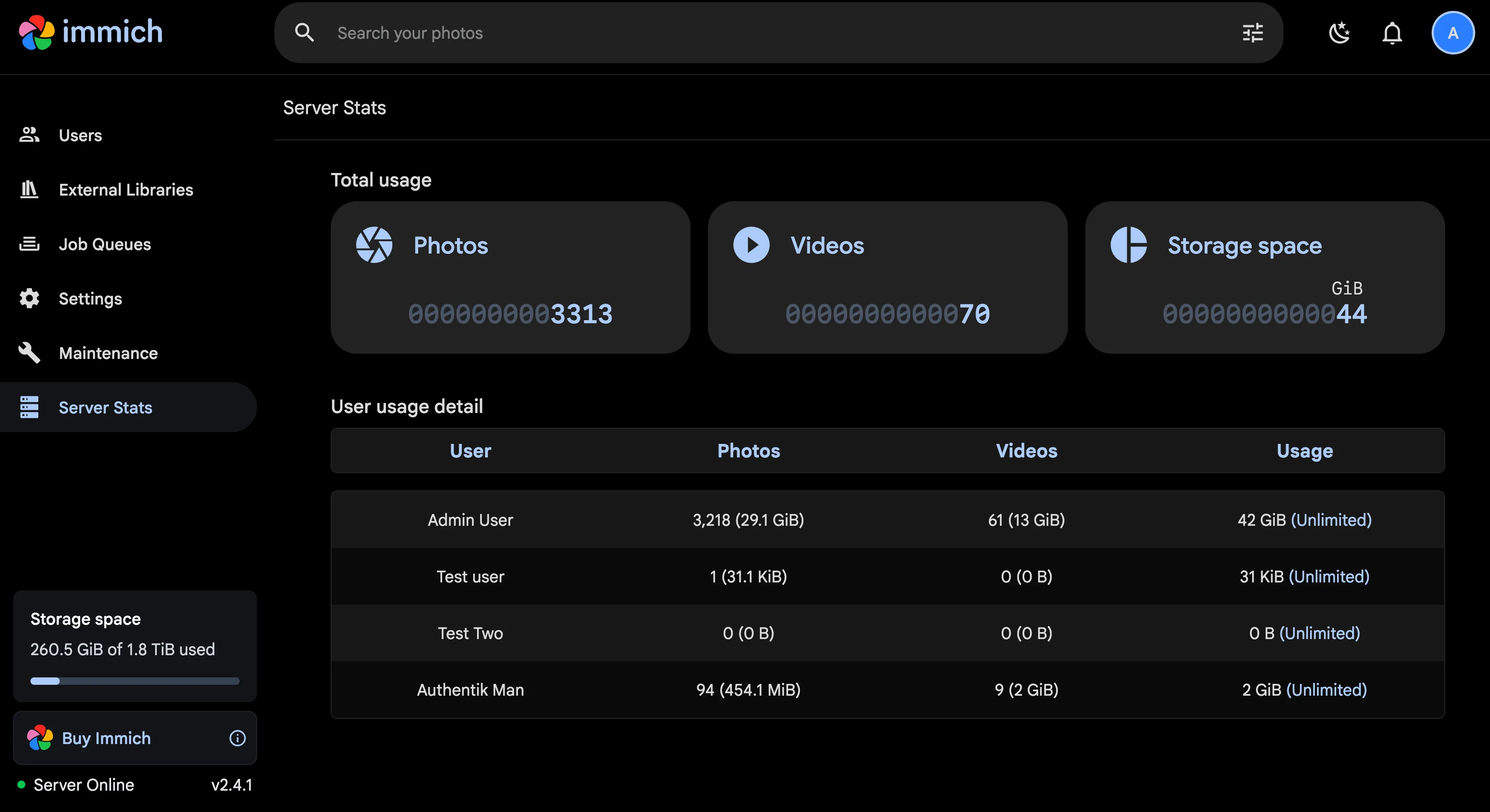 Server statistics to show the total number of videos, photos, usage and quota per user.